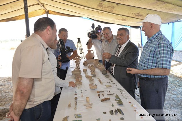 Həmin tədqiqatlar zamanı bünovrə hissəsi çaydaşı, divarları çiy kərpicdən hörülmüş ictimai binalar, yaşayış evləri və yardımçı tikililərin qalıqları, daş döşənmiş yollar, içərisində müxtəlif ərzaq qalıqları olan iri təsərrüfat küpləri və rəngarəng çeşidli digər məişət əşyaları aşkarlanıb. Tapıntılar əsasən daş, metal, saxsı, sümük və şüşədən hazırlanmış yerli istehsal nümunələridir. Bununla belə aşkar olunan maddi-mədəniyyət nümunələri içərisində ticarət və mədəni əlaqələr yolu ilə gətirilmiş materiallar da vardır. Qazıntılar nəticəsində Roma, Sasani və Bizans dövlətlərində zərb olunan mis və gümüş sikkələr tapılıb. Tunc və əqiq möhürlər, nərd zərləri və daşları, ilbiz formalı nadir saxsı qablar abidənin zənginliyindən xəbər verir. 2015-ci ilin iyun ayında 9B kvadratında yer səthindən 60 sm dərinlikdə tunc fibula-sancaq, sədəf və pastadan muncuqlarla birlikdə qiymətli daşdan qaşı olan qızıl üzük və 9Ç kvadratında 60 sm dərinlikdə aşkar edilmiş qızıl zəncirin hissəciyi xüsusilə böyük maraq doğurur. Xatırladaq ki, bu nümunələr Ağsu arxeoloji ekspedisiyasının son 3 ildə aşkar etmiş olduğu üçüncü qızıl tapıntısıdır. Ərazidən aşkar olunmuş qızıl əşyalar ilkin tədqiqatdan sonra Milli Azərbaycan Tarixi Muzeyinin qızıl əşyaların saxlandığı Xüsusi fonduna təhvil veriləcək.